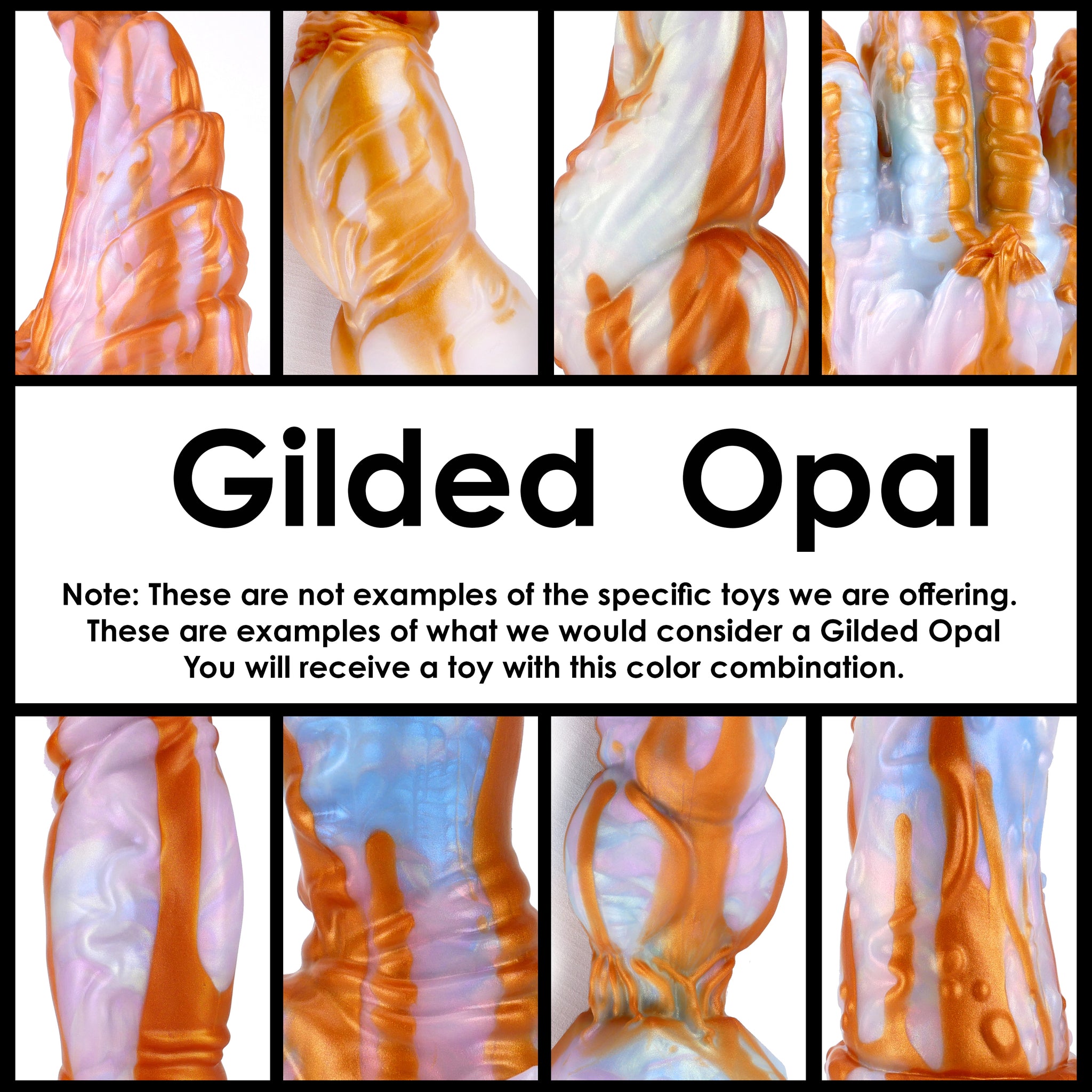 -Gilded Opal: Drips of rich gold over a soft, shimmery, pearly blend of colors (Please note: the colors are a little different for every opal blend)