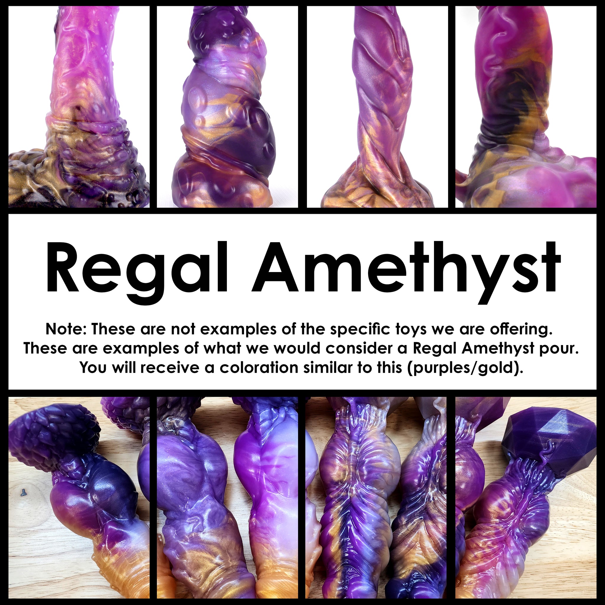 -Regal Amethyst: dark purple, bright purple, purple shimmers, and gold