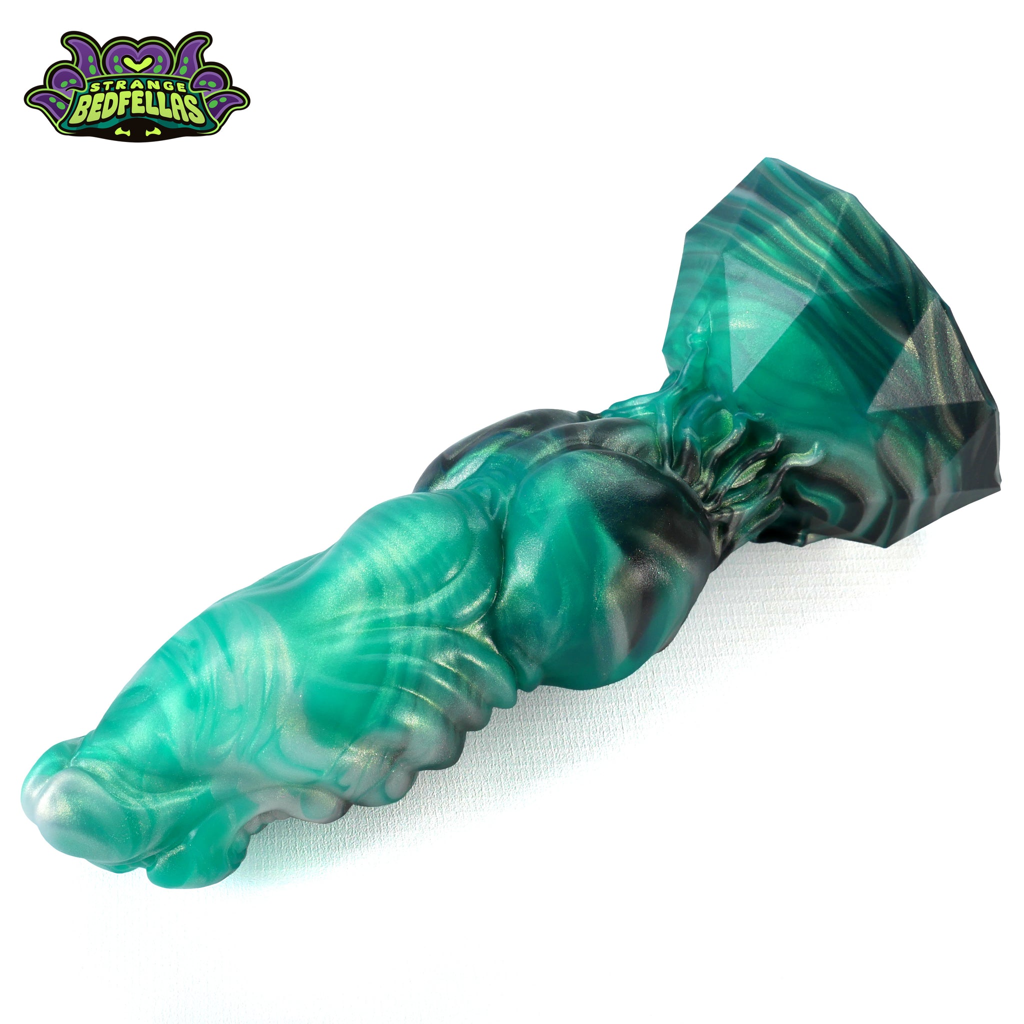 Fornax’s design features a lumpy, angled head and a shaft with smooth lumps on one side and soft, vertical, ribbed textures on the other. There is an ovular knot at the bottom of the shaft and a small stem below it for ease of tying. The base is a polyhedral pattern.