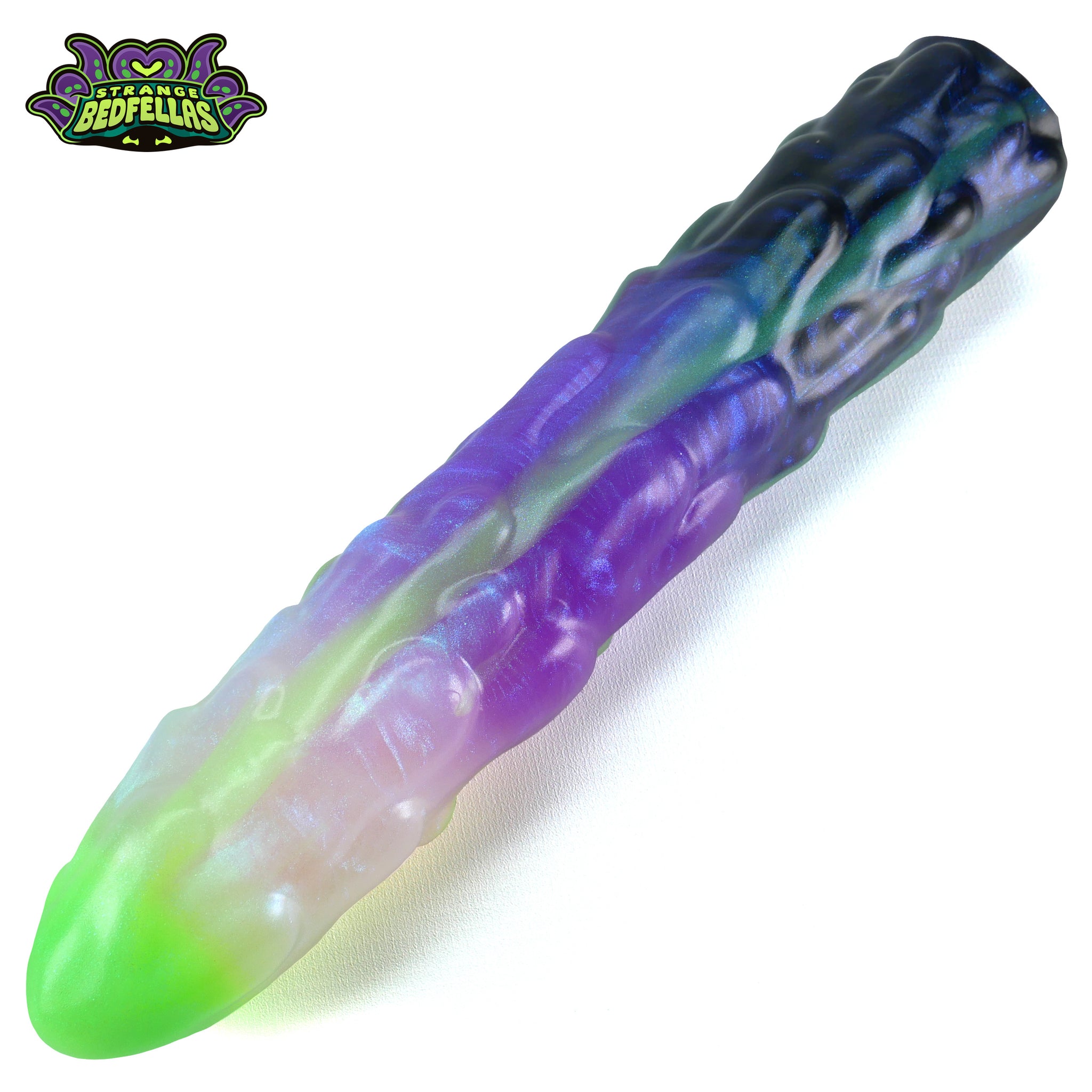 This is a design called Gelle Slime (rhymes with the word bell) This toy was designed to be a double ended model that could also be made as a single model as well. This design is long and smooth, with a flowery head full of texture. The shaft features a twisting vine pattern with light texture. It is a very consistent size all the way down the toy. This is a long, thin model intended for vaginal use. Because there is no flare to the base it is not intended for anal use. The double ended version of this toy is created by smooshing one of each end together while the silicone is still wet. This creates a seam half way along the toy, but it also ensures the two ends cure together and cannot be pulled apart. The seam is trimmed down, but it is always easy to tell where it is. This model is prone to flaws. Sometimes the join doesn't work well (usually a timing issue) and it comes apart to form two singles instead of a double ended toy. In this instance the base of the resulting toys are either concave or convex. They are still safe to use, they just have a non-flat base. Another flaw the double ended version can have is a weak seam that is patched with sil-poxy (silicone glue). The sil-poxy is always at the seam and is visible, but helps make sure the two sides have a steady hold on eachother and don't pull apart. These flaws will be noted on the listing and discounted accordingly.